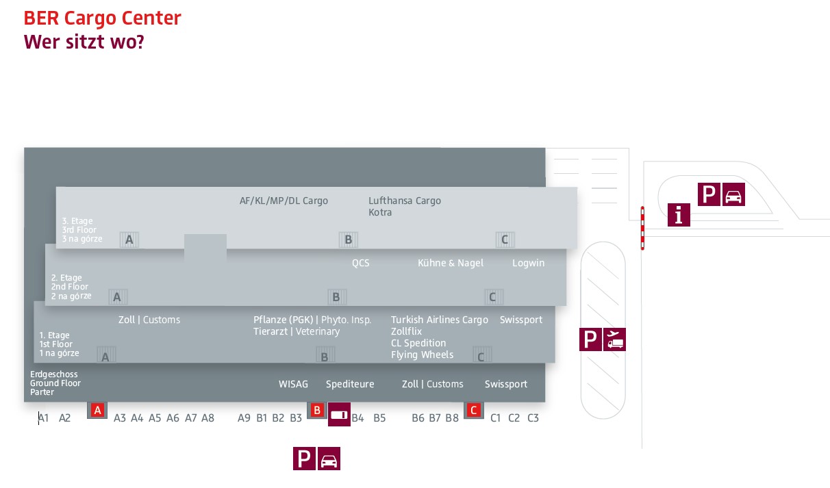 Achten Sie bei Ihrer Anfahrt mit dem LKW oder PKW auf das Cargo-Piktogramm, um zum Cargo Center zu gelangen.