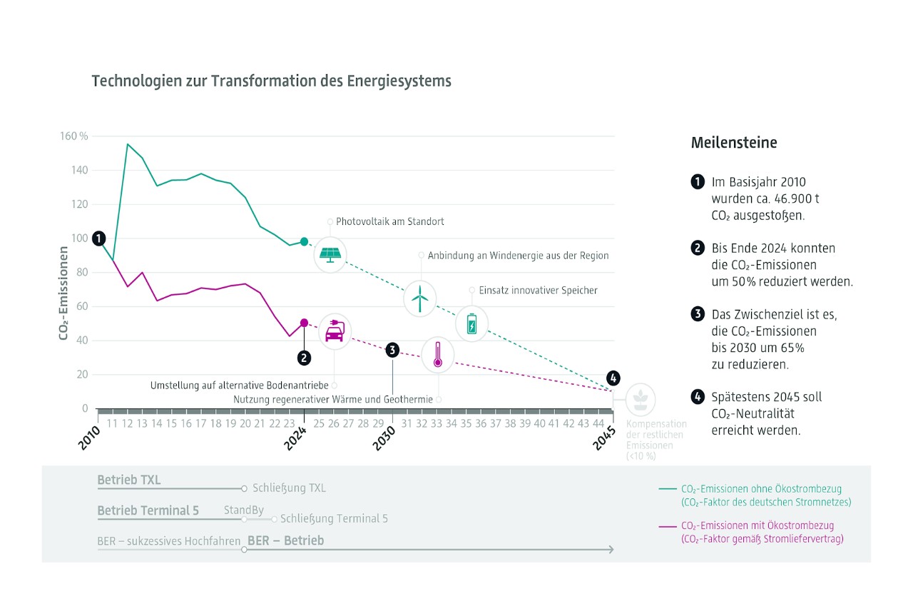 In unserer CO2-Roadmap haben wir wesentliche Handlungsfelder beschrieben, die sich auf eine Vielzahl von operativen Bereichen des Flughafens auswirken. Diese reichen von der weiteren Steigerung der Energieeffizienz gemäß ISO 50001 innerhalb der Infrastrukturen und einzelnen anlagentechnischen Systemen über den Einsatz regenerativer Energien bis hin zur Ausnutzung von Synergien am Standort.