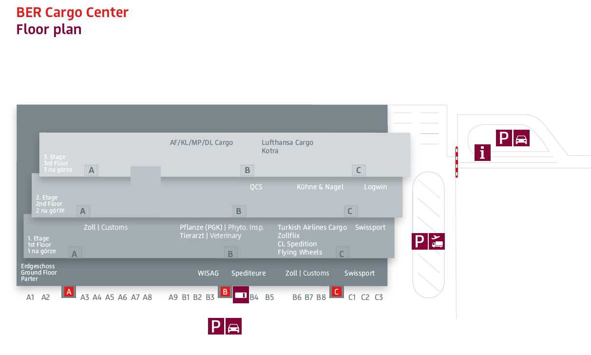 When approaching by truck or car, look for the Cargo pictogram to get to the Cargo Center.