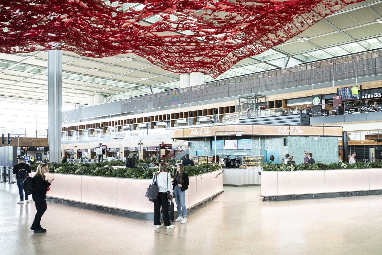 The ‘Adler & Bär’ bar gives the publicly accessible check-in hall a new meeting point for travellers, their companions and visitors before the security control. Directly above the bar hangs the striking ‘red carpet’, the artwork ‘THE Magic Carpet’ by Californian artist Pae White. A modern lighting concept creates an atmospheric ambience. The name ‘Adler & Bär’ refers to the heraldic animals of Brandenburg and Berlin. The area was previously used as an information point and ticket counter. The bar will be open from 4 a.m. to 10 p.m.